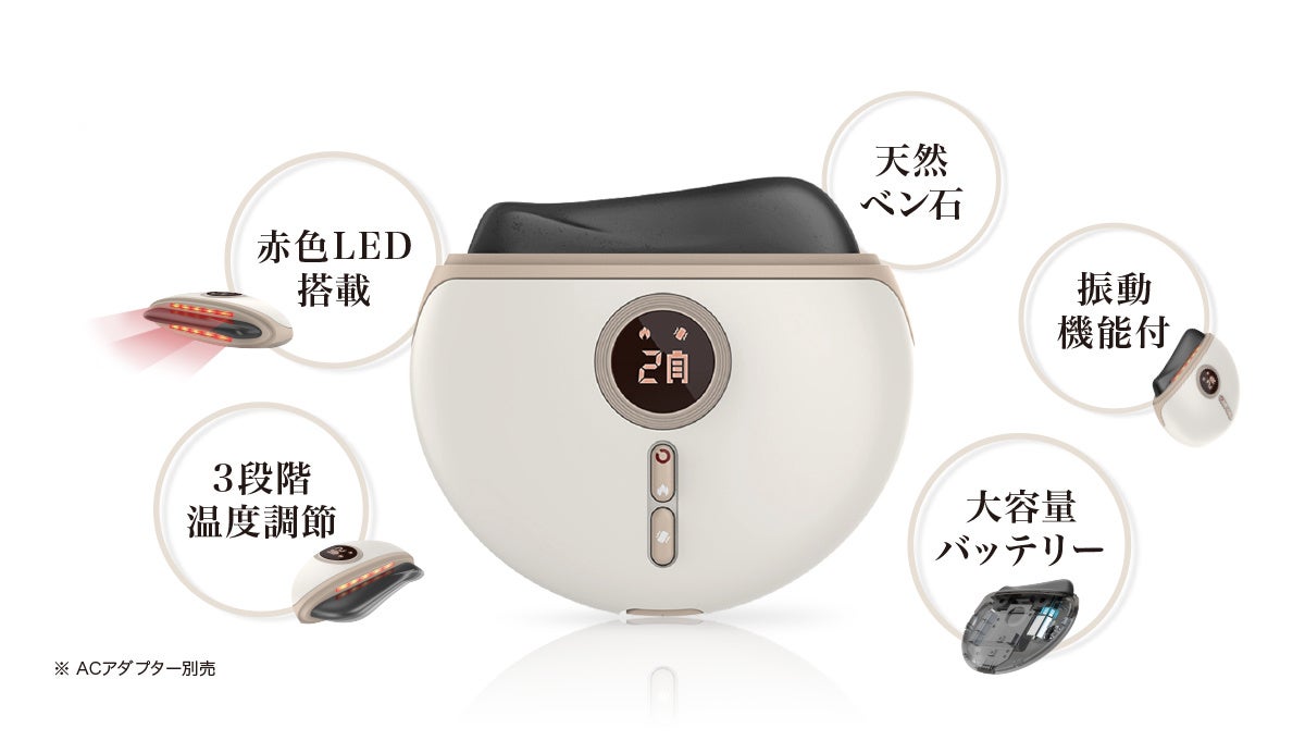 「Tech Love CaPo温感かっさ」は、エステティシャンの指のようなタッチを独自の形状の天然ベン石ヘッドで再現し、さらに「3段階の温度調節」、「赤色LED」、「振動」の機能で手軽にリフトケア(※2)を自宅で実現できます。毎日のケアで顔の明るさなど、マイナス肌で表情を豊かに美しく保つ習慣をつけましょう!
