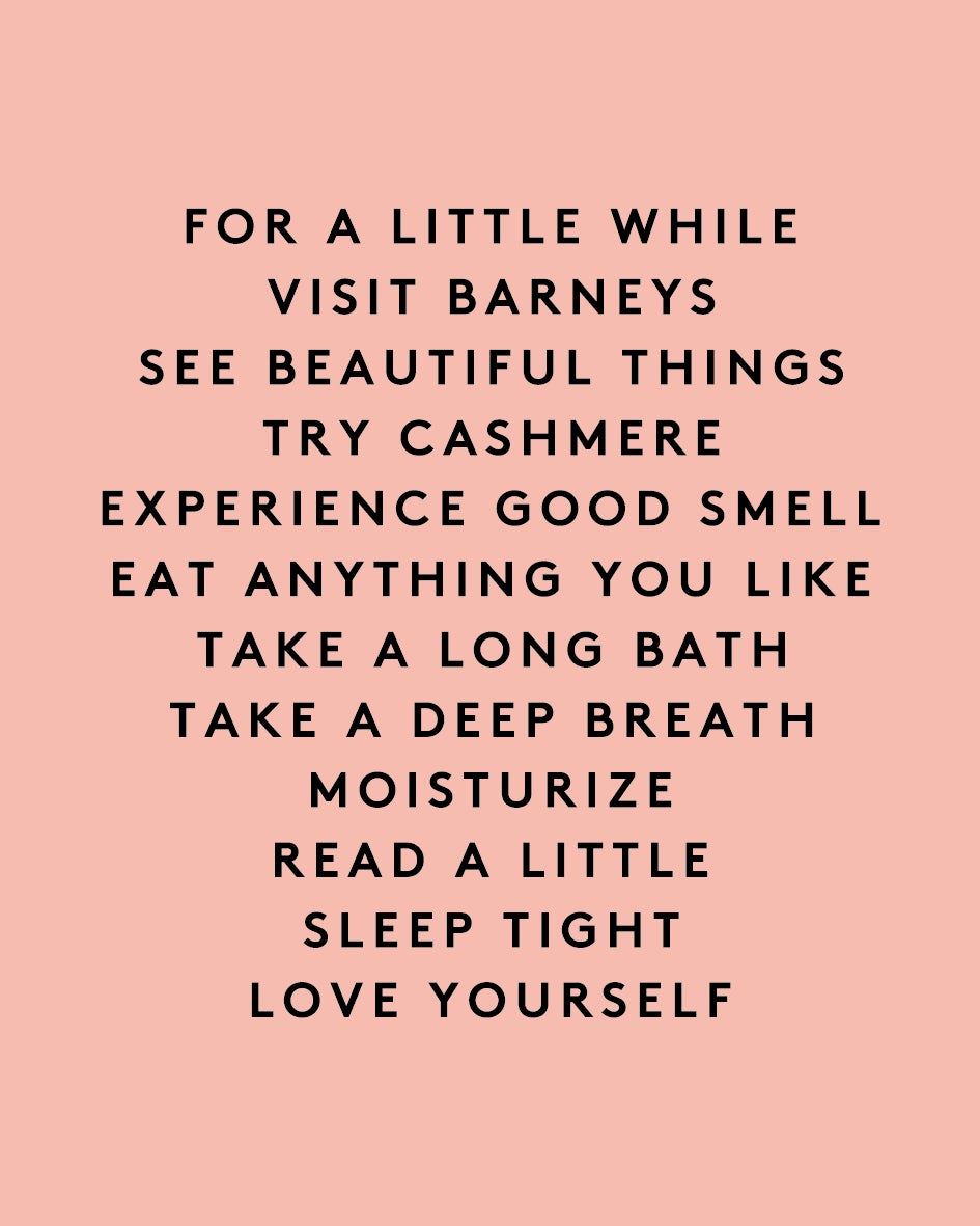 米国のバーニーズ ニューヨークの広告よりインスパイアされた文章のみで構成されるデザインを中央に掲げたウィンドウディスプレイ。「VISIT BARNEYS」「SEE BEAUTIFUL THINGS」「TRY CASHMERE」「TAKE A LONG BATH」「SLEEP TIGHT」「LOVE YOURSELF」など、自分自身を慈しみ、労わるワードを並べ、様々なフレグランスやアポセカリーアイテムとともに、女性が自宅でリラックスタイムを過ごす姿を表現しています。