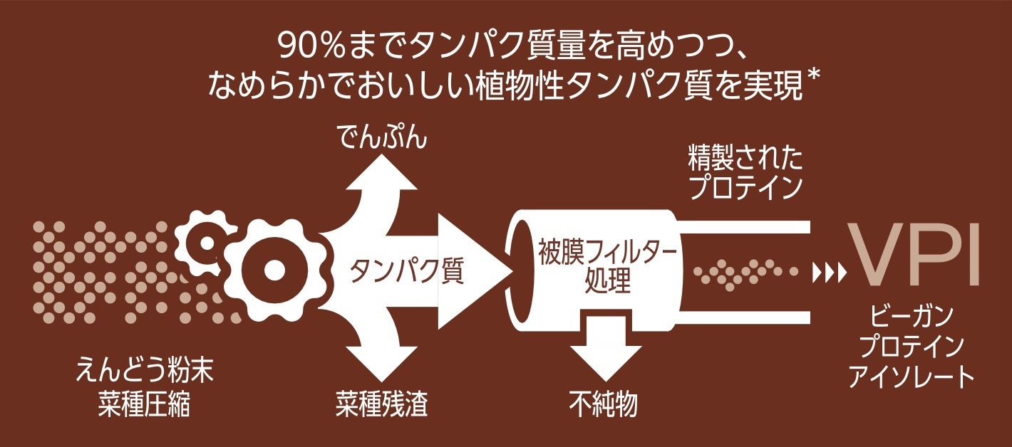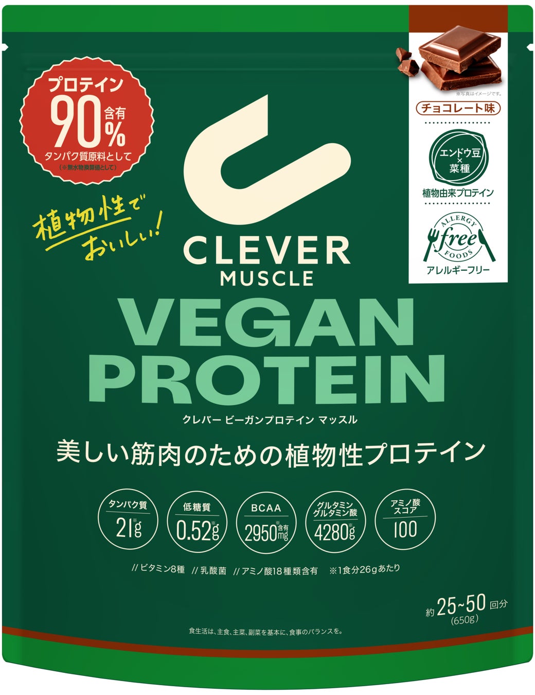 今回発売となる「クレバー ビーガンプロテイン」は、VPI(ビーガンプロテインアイソレート)を採用し、エンドウ豆と菜種の独自配合・製法特許*2により、植物性でありながらも90%*1含有の高タンパク質を実現しています。VPIは、さっと水になじみ、アミノ酸のBCAAやアルギニンも多く、ウエイトトレーニングやスポーツを行う方におすすめのプロテインパウダーです。