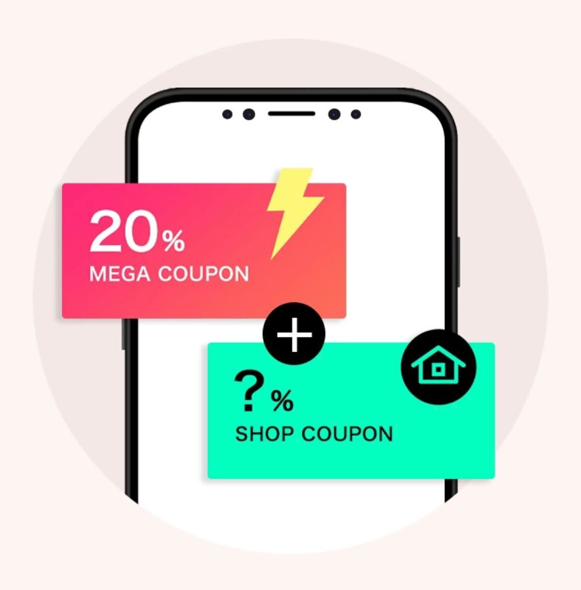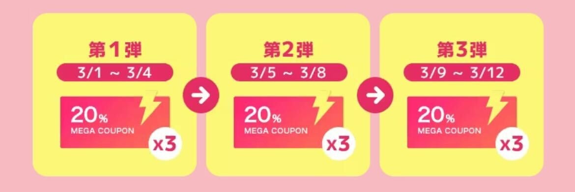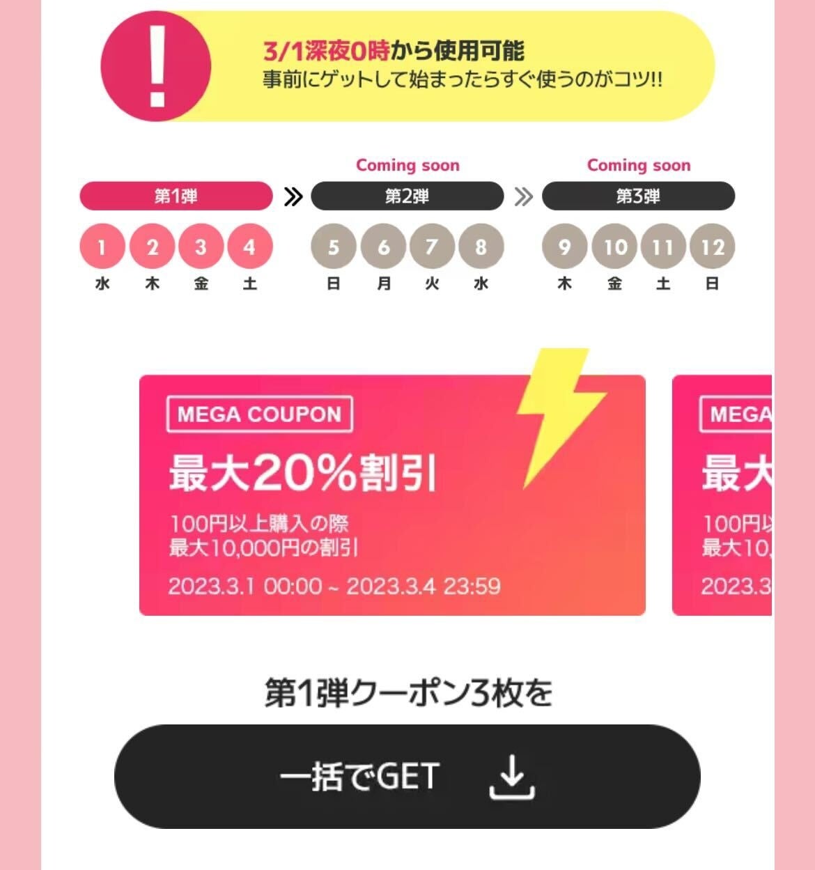 「メガ割」期間中、対象商品の買い物で使用できる20%オフクーポンが9枚も配布され、