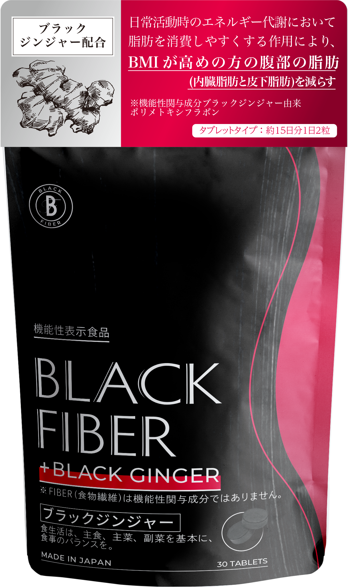 この度新たに加わった「ブラックファイバー ブラックジンジャープラス」は、シリーズ共通成分である活性炭と酒粕に加え、機能性関与成分であるブラックジンジャー由来ポリメトキシフラボンを配合した、お腹の脂肪を消費しやすくする機能性表示食品です。