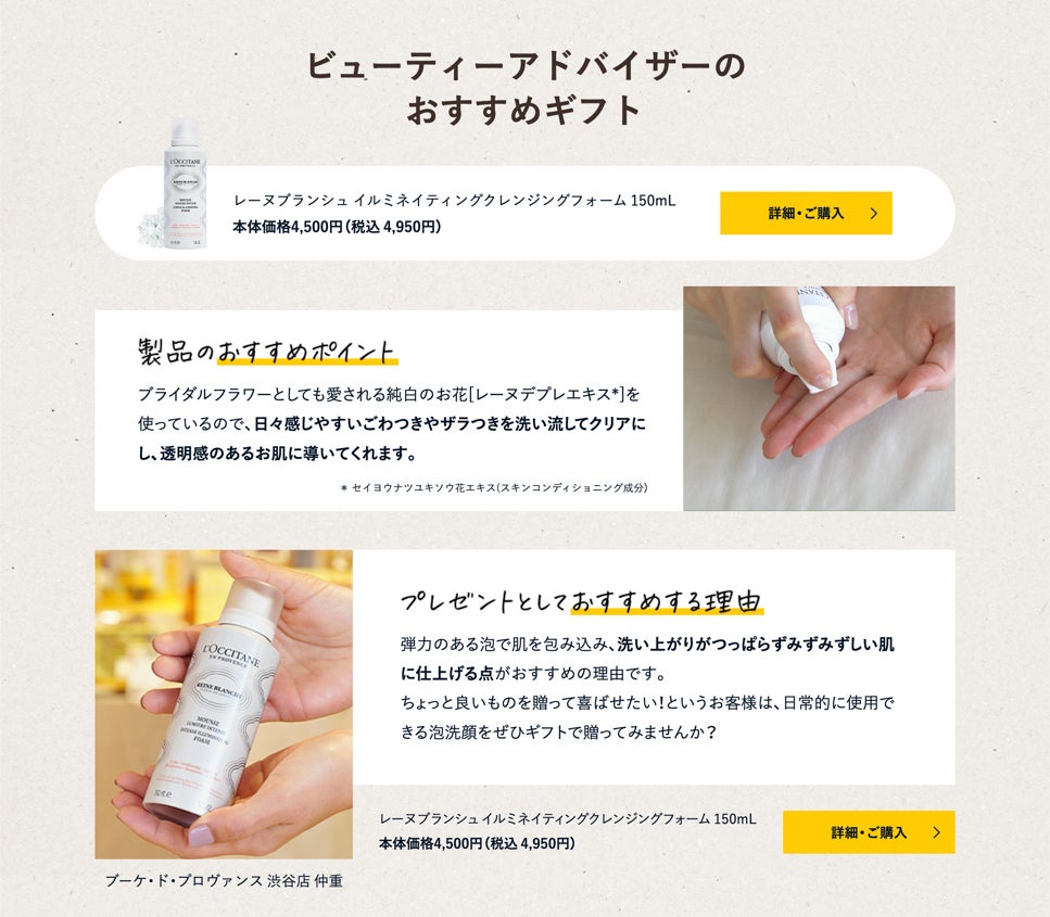 リニューアルしたギフトサイトには、ギフトアイデアがたくさん。春にニーズが高まる送別ギフトにおすすめの限定キットや、記念日・出産祝い・新生活ギフトなどシーンにぴったりのギフトをご紹介。また新たに、ロクシタンの店舗で働くビューティーアドバイザーおすすめのギフトもピックアップしています。ビューティーアドバイザーが考える、製品のおすすめポイントやプレゼントとしておすすめする理由も掲載されていて、ギフト選びの参考にしていただけます。さらに名入れギフトとしても人気の「マイシア」や、かわいいラッピングサービスについても詳しくご覧いただけます。