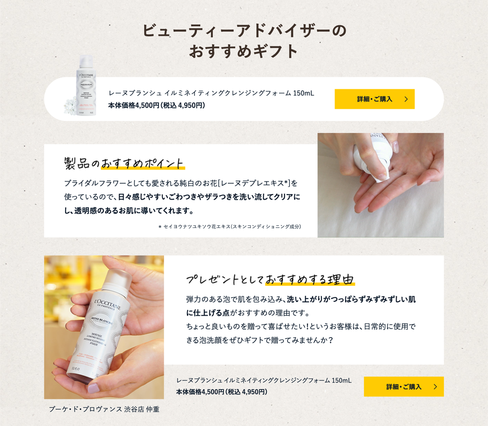 リニューアルしたギフトサイトには、ギフトアイデアがたくさん。春にニーズが高まる送別ギフトにおすすめの限定キットや、記念日・出産祝い・新生活ギフトなどシーンにぴったりのギフトをご紹介。また新たに、ロクシタンの店舗で働くビューティーアドバイザーおすすめのギフトもピックアップしています。ビューティーアドバイザーが考える、製品のおすすめポイントやプレゼントとしておすすめする理由も掲載されていて、ギフト選びの参考にしていただけます。さらに名入れギフトとしても人気の「マイシア」や、かわいいラッピングサービスについても詳しくご覧いただけます。