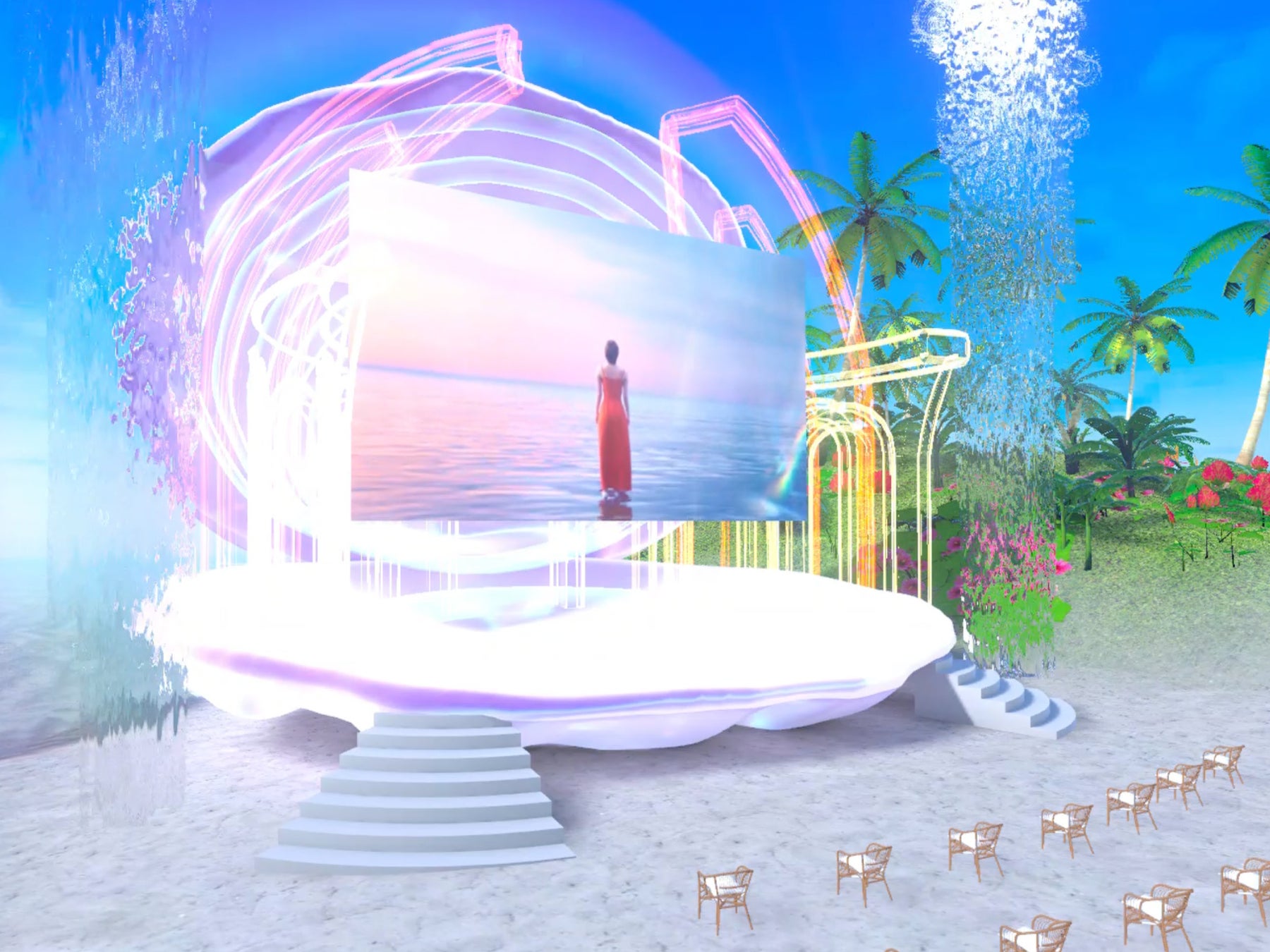 ・巨大な真珠貝を模したステージに大きなスクリーンを設置、ブランドムービーをはじめ様々な映像を放映します