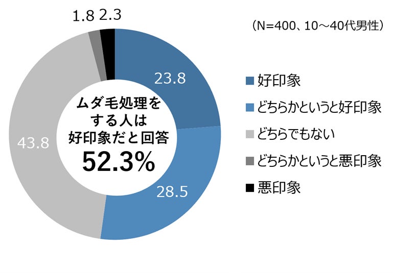 自社調査※によると、ムダ毛処理をする男性に対して半数以上の男性が好印象に感じると回答しました。男性から見て「ムダ毛処理をしている男性」はおおむね好印象であることが読み取れます。