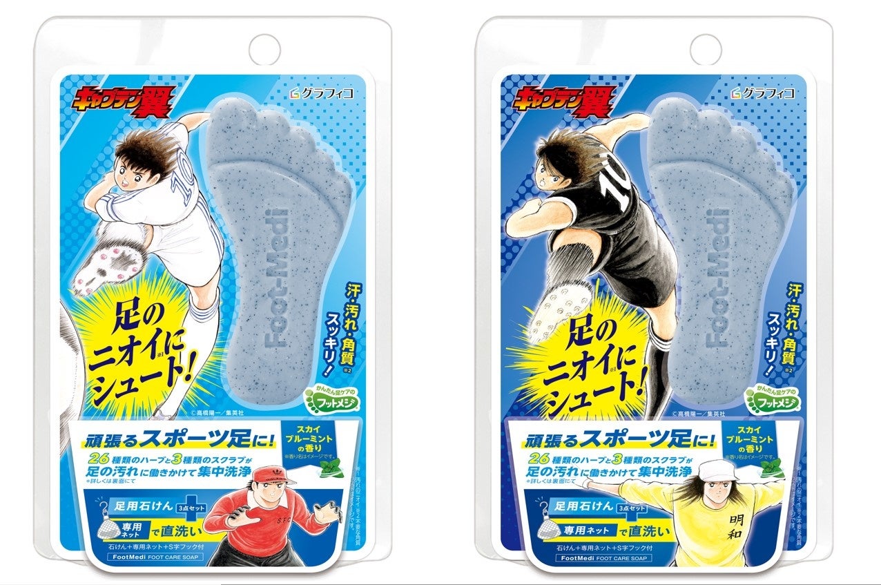 期間限定のコラボレーション商品「フットメジ 足用角質クリアハーブ石けん スカイブルーミント」(大空翼×若林源三パッケージ、日向小次郎×若島津健パッケージの2種類)を全国のドラッグストア他で発売。また、大空翼×岬太郎のゴールデンコンビのアウトドアチェアなど、フットメジ×『キャプテン翼』オリジナルグッズが当たるキャンペーンを実施します。