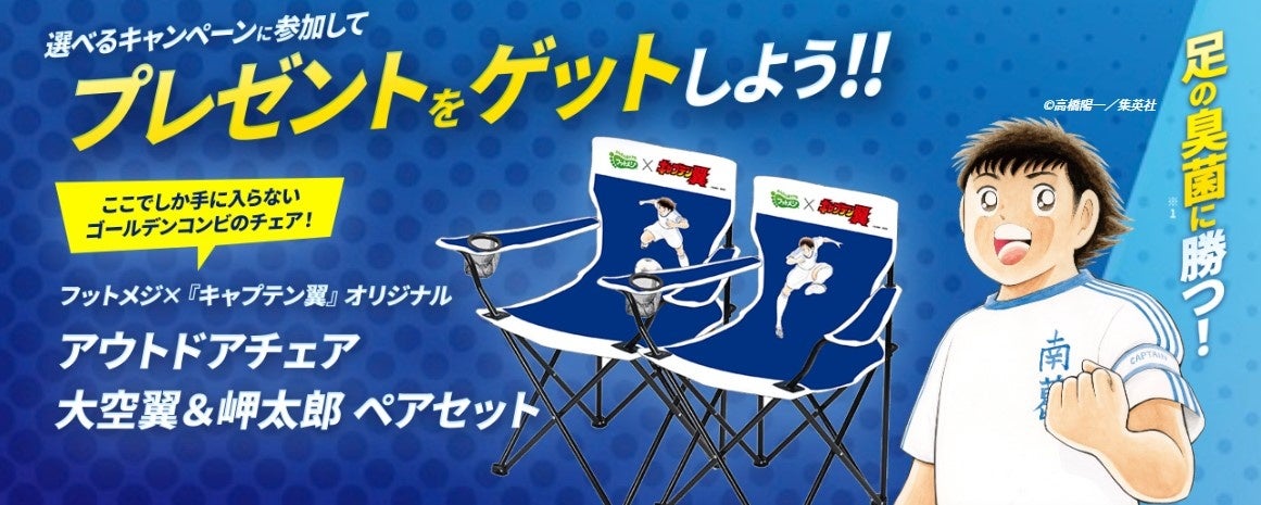 Twitterでフットメジ公式アカウント @foot_medi をフォローし、対象ツイートをリツイートすると、抽選で10名様にフットメジ×『キャプテン翼』 オリジナルアウトドアチェア 大空翼×岬太郎ペアセットをプレゼントします。