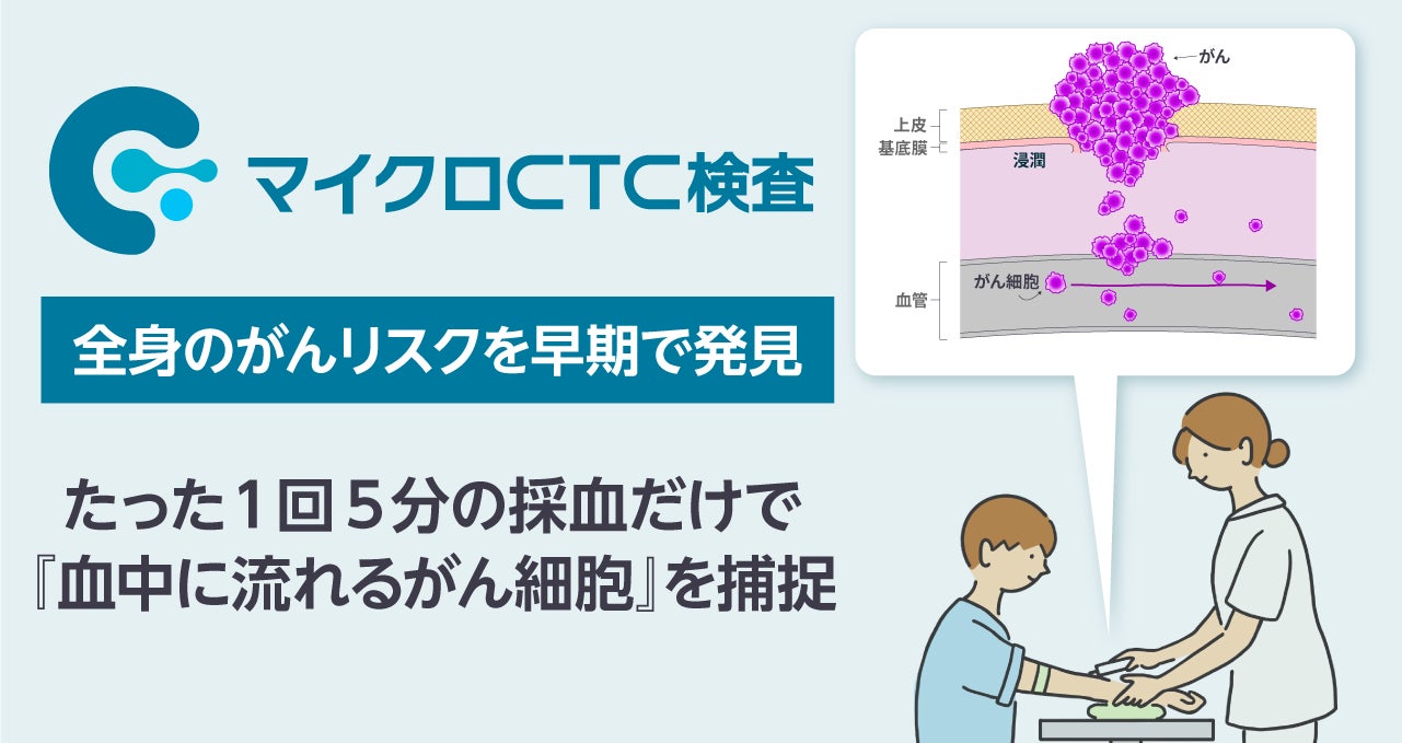 『マイクロCTC検査』は、血中に漏れ出したがん細胞そのものを捕捉することで、悪性度の高いがんを細胞レベルで特定することができる検査手法です。国内において、がんは死因トップ、日本人の2人に1人以上が「がんになる」にも関わらず、身体的・時間的な負担が大きいことから検診率は50%にも満たない状況です。さらには、コロナ禍で”受診控え”も進む現状もあります。こうした状況を打開するため、より安全で手軽かつ明確に全身のがんリスクを判定できるサービスとして、マイクロCTC検査を一人でも多くの方にご利用いただけるように尽力し、「がんの不安と苦しみをなくす」というミッションを実現してまいります。