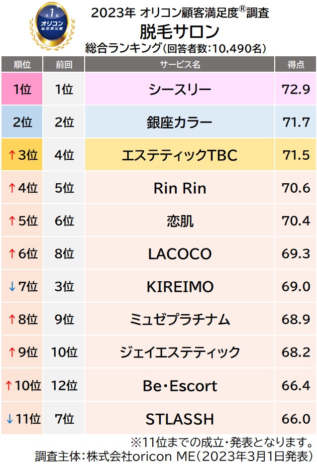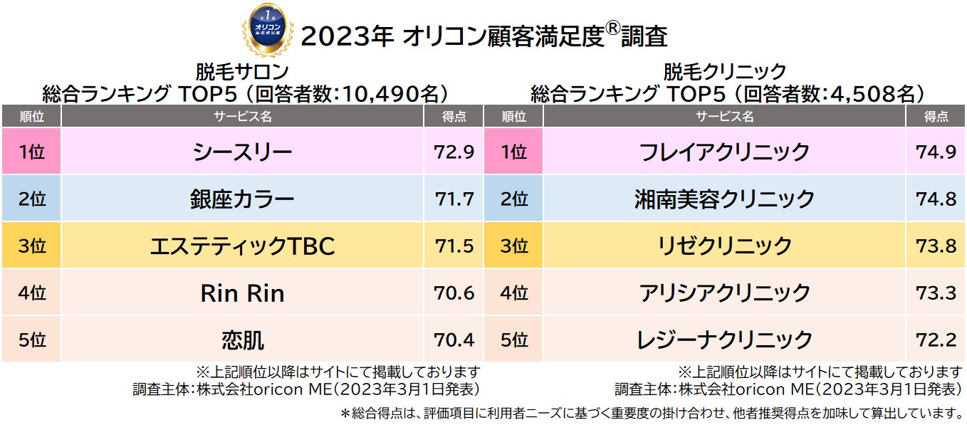 - 《調査概要》 2023年 オリコン顧客満足度®調査 脱毛サロン