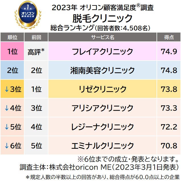 - 《調査概要》 2023年 オリコン顧客満足度®調査 脱毛クリニック