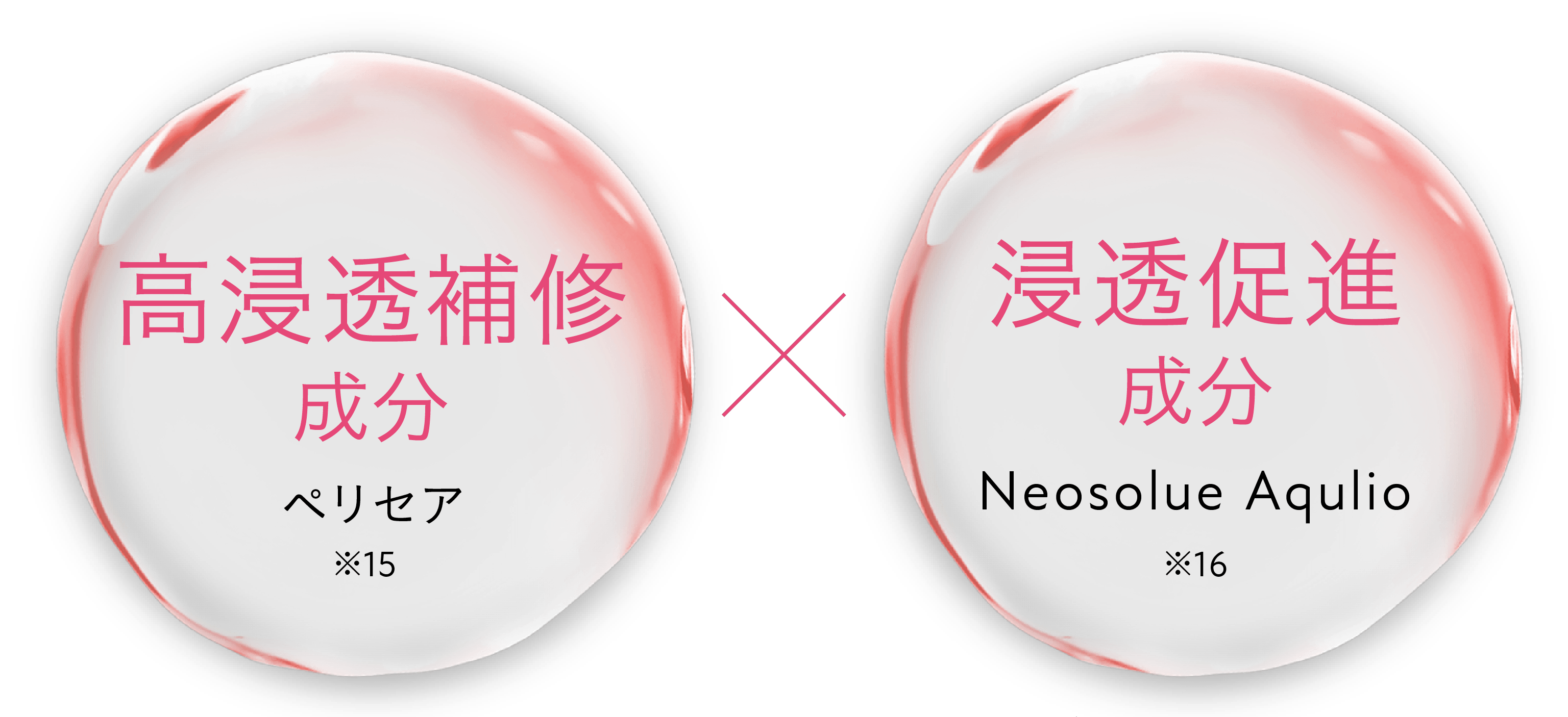 高浸透補修成分※15と浸透促進成分※16を掛け合わせることで美容成分を髪内部にすばやく届けながら、毛髪補修成分とキューティクルケア成分*が髪の内部・外部からダメージを補修します。