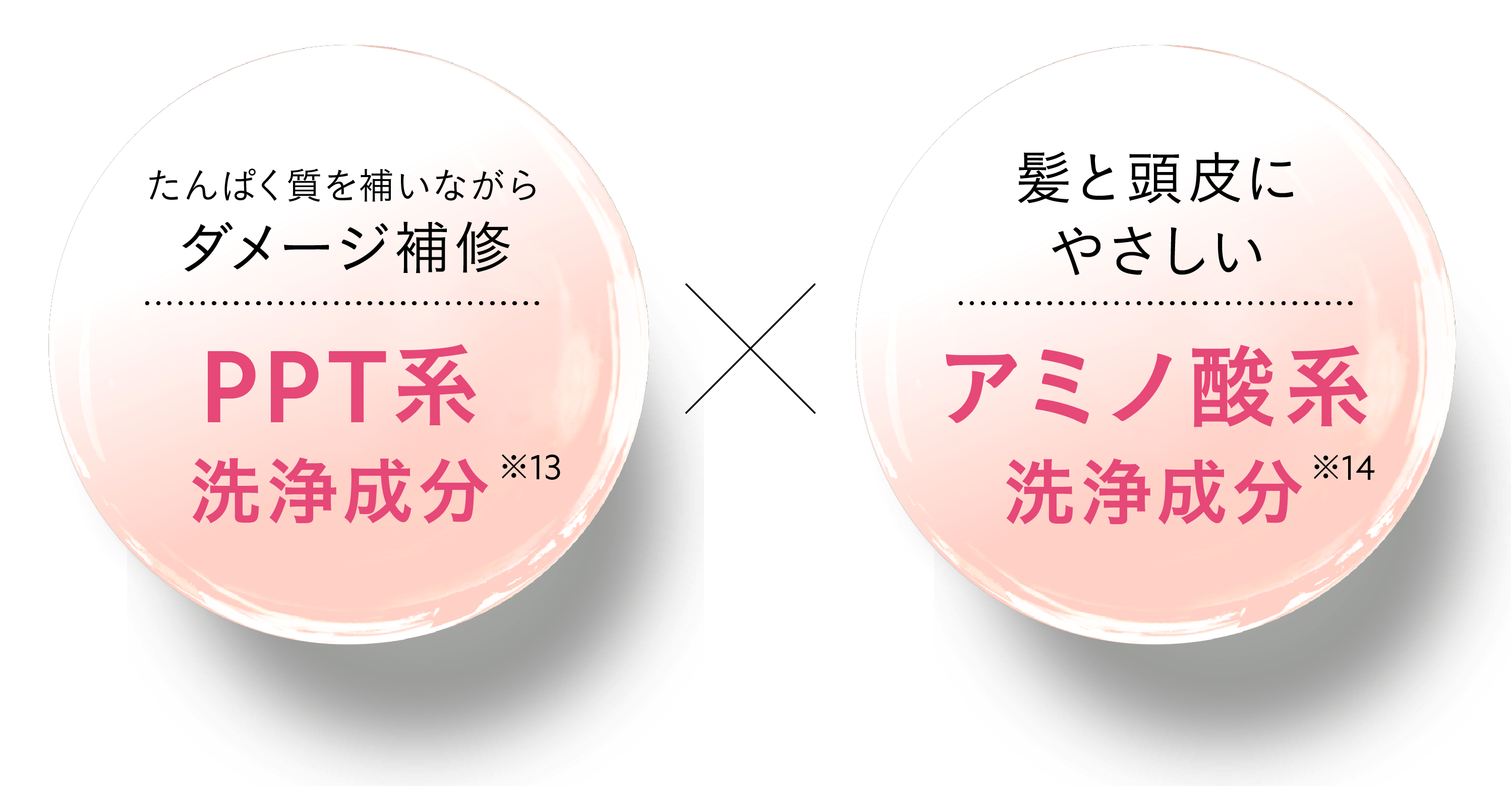 ダメージ補修をしながら洗い上げるPPT系洗浄成分※13と髪と頭皮をやさしく洗い上げるアミノ酸系洗浄成分※14をW採用。髪と頭皮をいたわりながら、毛髪ダメージにアプローチします。