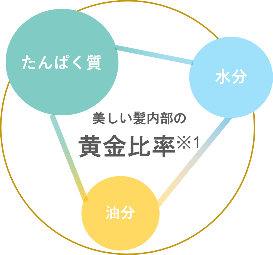 ※1 一般的に美しいといわれる毛髪内部の比率構成 ※2 アルギニン、アスパラギン酸、グリシン、アラニン、セリン、バリン、イソロイシン、トレオニン、プロリン、ヒスチジン、フェニルアラニン(ここまで全て保湿成分)、加水分解エンドウタンパク、加水分解ローヤルゼリータンパク、加水分解コメタンパク、加水分解ダイズタンパク(ここまで全て毛髪補修成分) ※3 ステアルジモニウムヒドロキシプロピル加水分解ケラチン(羊毛)、イソステアロイル加水分解ケラチン(羊毛)、マカデミアナッツ脂肪酸フィトステリル(全て毛髪補修成分) ※4 アルギニン、アスパラギン酸、グリシン、アラニン、セリン、バリン、イソロイシン、トレオニン、プロリン、ヒスチジン、フェニルアラニン(全て保湿成分) ※5 シャンプー:ポリクオタニウム-65 トリートメント、ヘアオイル:ポリクオタニウム-51 ※6 加水分解ヒアルロン酸、ヒアルロン酸ヒドロキシプロピルトリモニウム ※7 セラミドNG、セラミドNP、セラミドAP ※8 アルガニアスピノサ核油 ※9 ホホバ種子油 ※10 ステアルジモニウムヒドロキシプロピル加水分解ケラチン(羊毛)、イソステアロイル加水分解ケラチン(羊毛)(全て毛髪補修成分) ※11 マカデミアナッツ脂肪酸フィトステリル(毛髪補修成分) ※12 (ジヒドロキシメチルシリルプロポキシ)ヒドロキシプロピル加水分解シルク(毛髪補修成分) ※13 ラウロイル加水分解シルクNa、ココイル加水分解ケラチンK(羊毛) ※14 ラウロイルメチルアラニンNa、ココイルメチルタウリンNa ※15 ジラウロイルグルタミン酸リシンNa ※16 シクロヘキサン-1,4-ジカルボン酸ビスエトキシジグリコール ※17 加水分解ケラチン(羊毛、カシミヤヤギ) ※18 クオタニウム-33(羊毛)、イソアルキル(C10-40)アミドプロピルエチルジモニウムエトサルフェート(羊毛) ※19 ラウロイルグルタミン酸ジ(フィトステリル/オクチルドデシル)