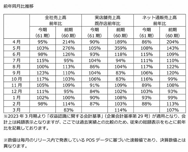 GINZALoveLoveは、アプリ会員を中心に1to1プッシュ通知や顧客へのデータマーケティングの展開を行ってまいりました。2月度は、前年のリユース買い取り特需が大きく影響しました。この結果、GINZALoveLove実店舗の既存店前年比は87%という実績となりましたが、店頭販売では前年並みで推移いたしました。また、ネット通販においては、売上高が前年比88%という結果になり、全社の前年比は98%という結果になりました。