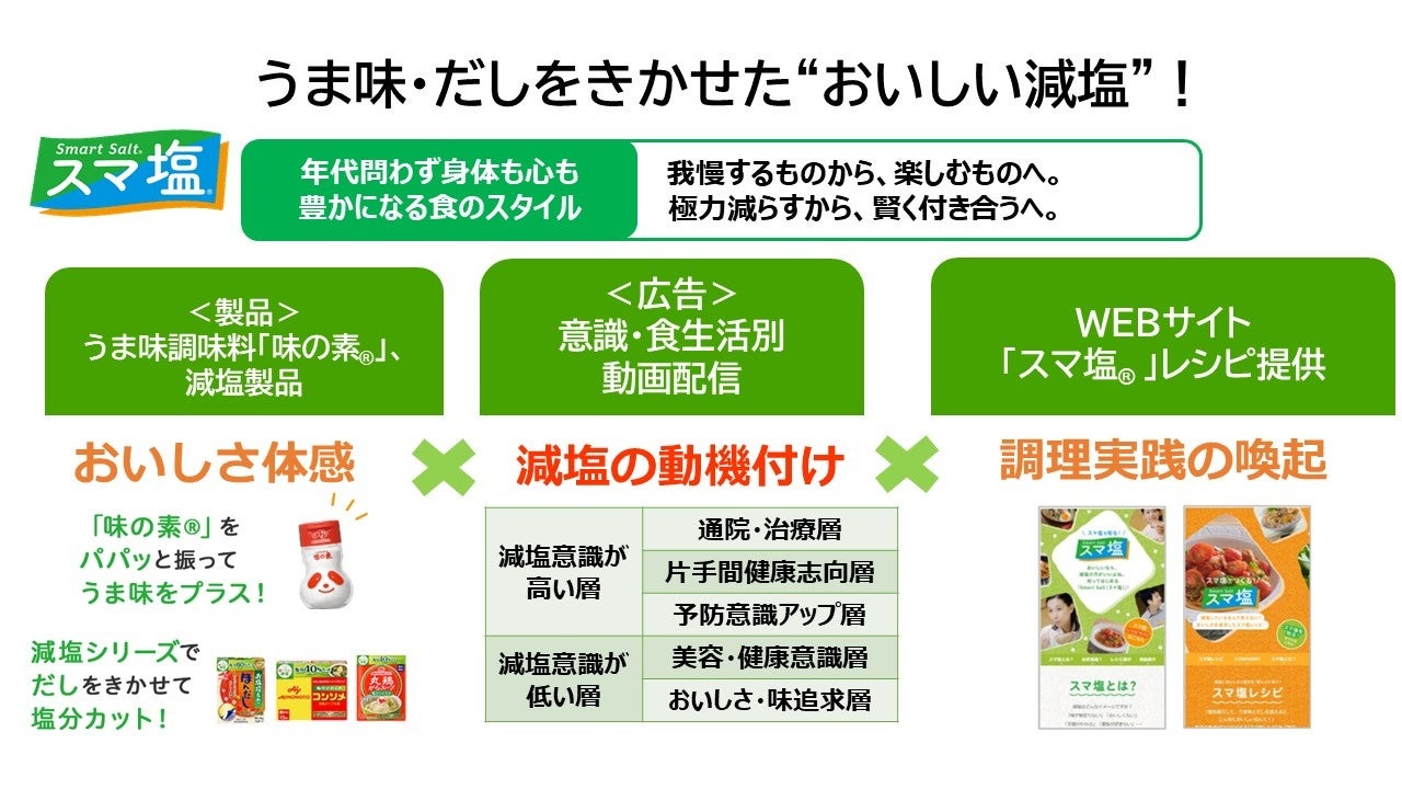 自社の強みであるアミノ酸の力を活かした減塩商品を通じ消費者の減塩意識や行動実態を把握。減塩を「我慢するものから楽しむもの」へとイメージを覆すため情報発信やおいしい減塩レシピを提供し、行動変容を促している。また、行政・流通等と連携した啓発活動や産学での研究成果発表等「減塩」を通じて健康寿命延伸を目指す取り組みとなっている。
