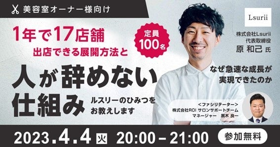 国内最大級の顧客満足度向上プラットフォーム「ファンくる」を運営する株式会ROI(本社:東京都千代田区、代表取締役社長:山口敬人)は株式会社Lsurii(本社:長野県長野市、代表取締役:原 和己)の原代表を お迎えし、「1年で17店舗出店できる展開方法と人が辞めない仕組み~ルスリーのひみつをお教えします~」 (定員:100名/無料)を4月4日(火)に開催いたします。(申し込み先:https://biz.fancrew.jp/seminar20230404_contact?=pr1)