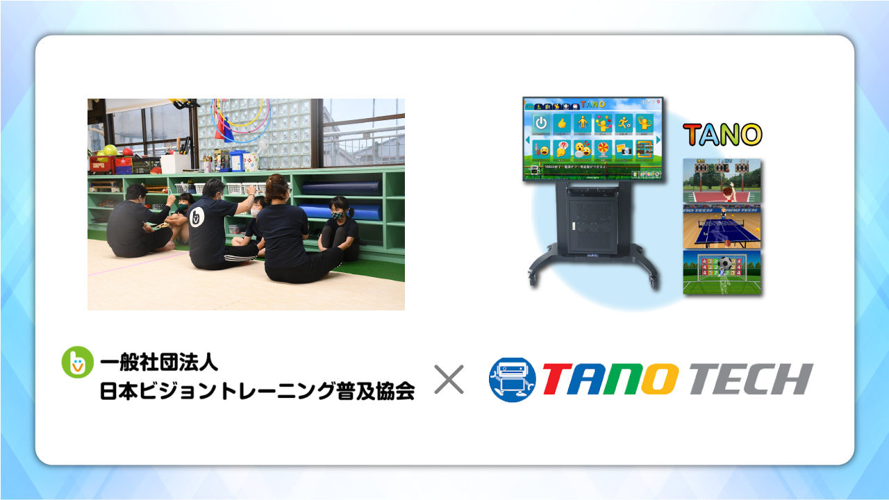 目で追って体を動かすことができるTANOは、ビジョントレーニングに適しており、TANOTECHではビジョントレーニング普及協会のノウハウを活かしたコンテンツの開発検討、ビジョントレーニング普及協会ではTANOのコンテンツを使用したビジョントレーニングカリキュラムの検討などを行い、両社で連携し、より良い環境づくりを目指してまいります。