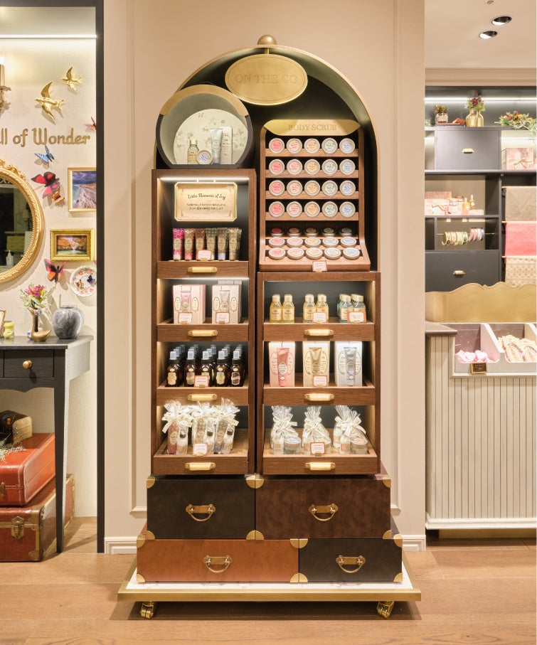ボディケアやフェイスケア、ホームアイテムなどの人気アイテムのミニサイズやキットを、「サボン オンザゴー」をテーマにしたトランクやバゲージカートをイメージしたコーナーに美しくディスプレイ。