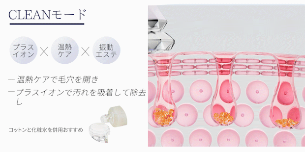 2.4W回/秒の超音波振動でお肌についている水分をミスト状にし、肌表面の油脂·メイク残し·毛穴の汚れを水と超音波振動で吹き飛ばします。すっぴんに自信が持ってる肌に。