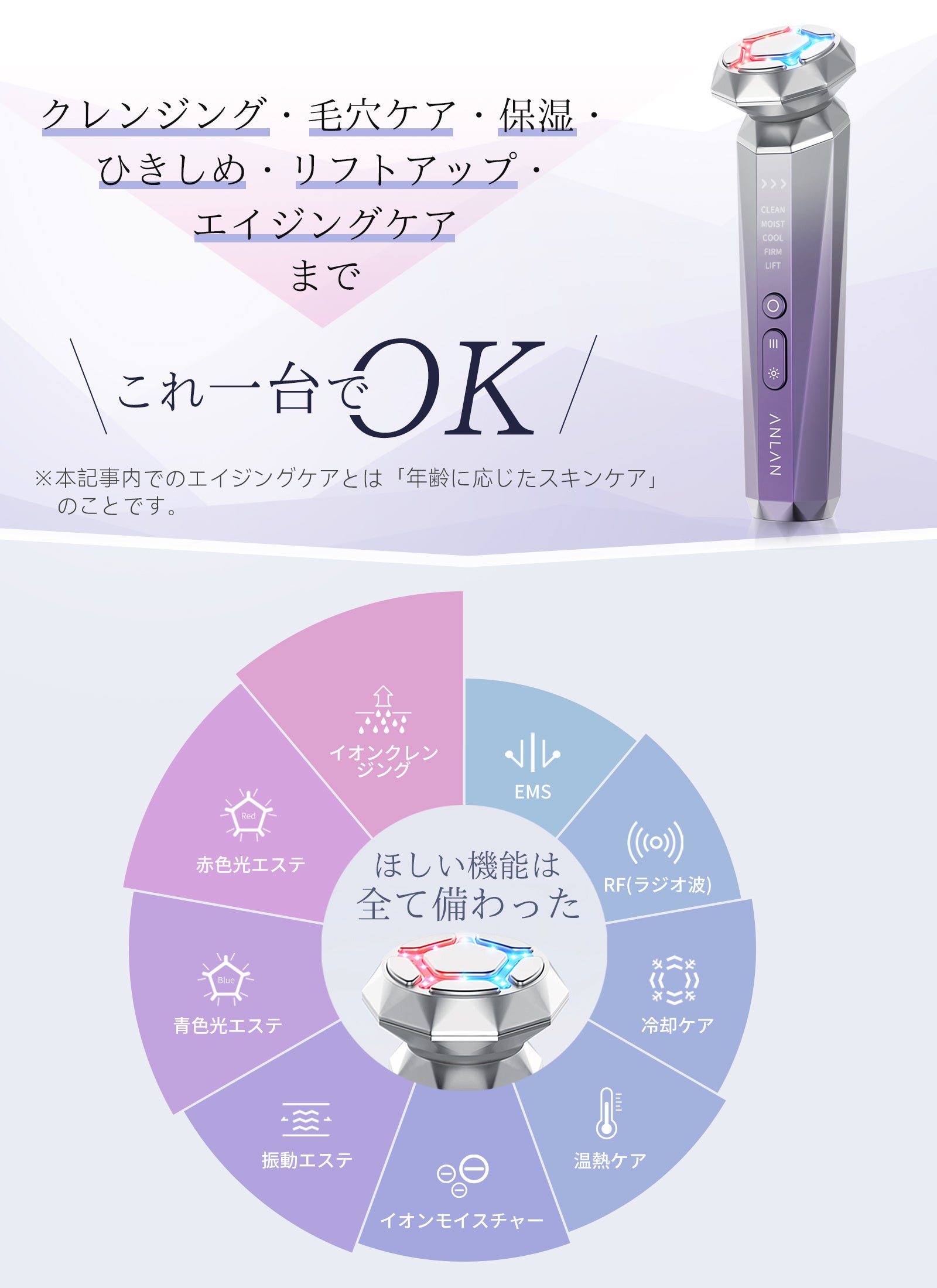 温冷ケア、EMS、光エステ、イオンクレンジング・イオンモイスチャーでお肌を全方位に集中ケア。