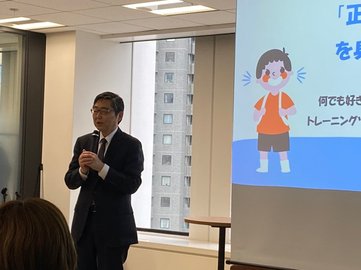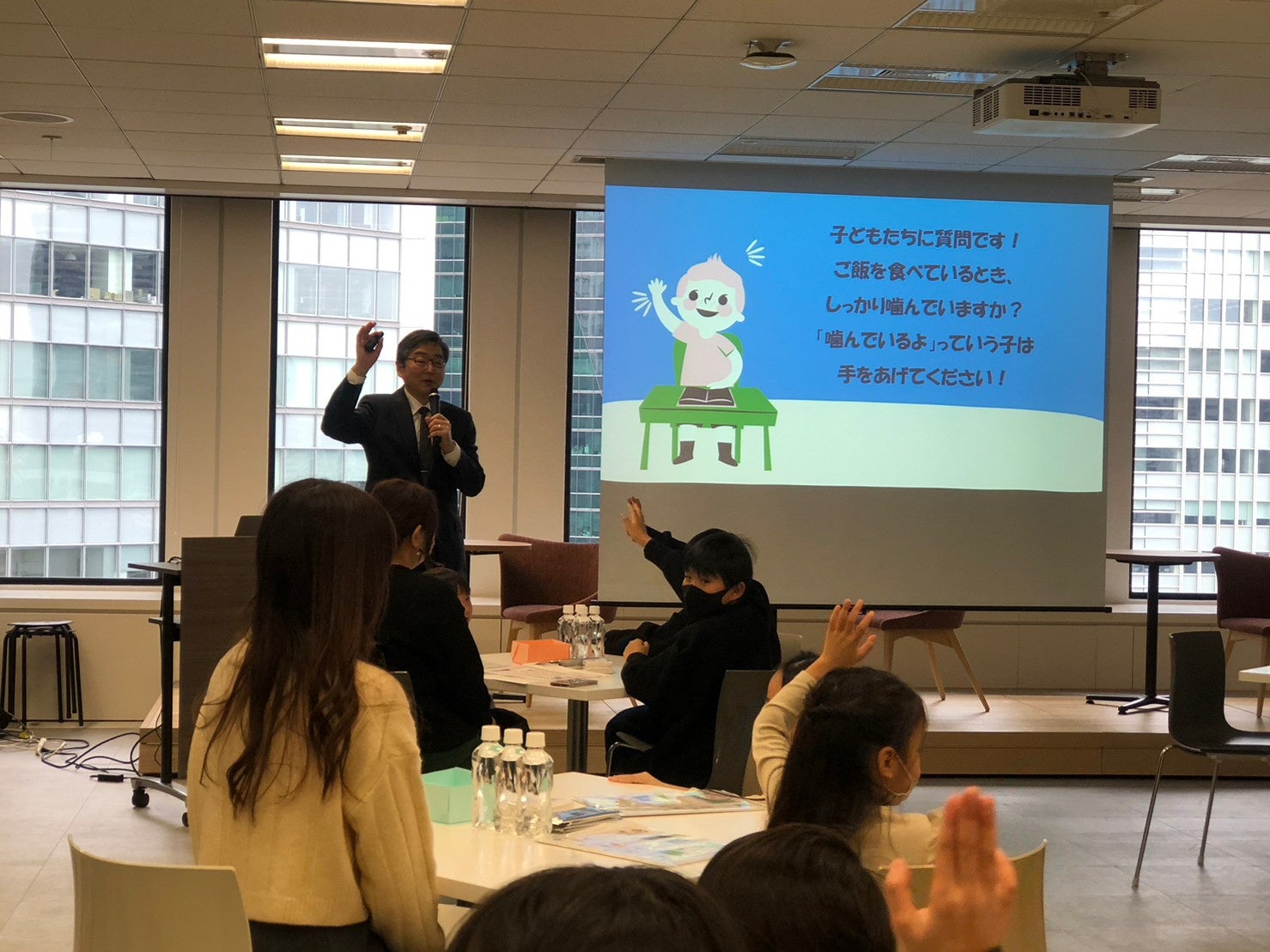 歯科医師・歯学博士の葛西一貴特任教授より、正しい噛み方やお口ポカンのリスクについてお話しいただきました。「食事のときによく噛んでいる人!」という質問には、ほとんどの子どもが元気よく挙手。参加した保護者は耳を傾け、真剣な表情で話に聞き入りました。「噛むことが大事な理由がしっかりと理解できて勉強になった」「正しい噛み方で歯並びが良くなることもあるとは驚きだった。子どもの歯並びが気になるのでたくさんガムを噛ませたい」などの感想もあり、噛むことの大切さをご理解いただけました。