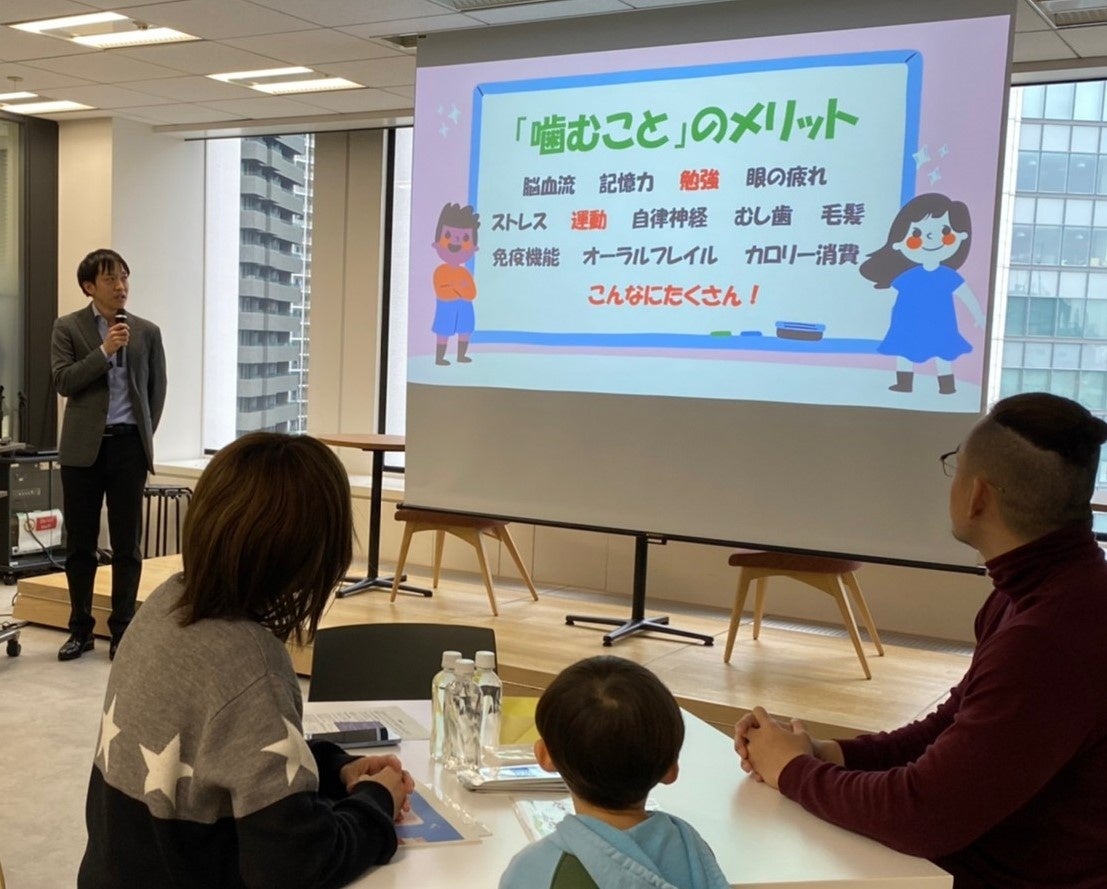 株式会社ロッテ(本社:東京都新宿区、代表取締役社長執行役員:牛膓栄一)は、子どもの口腔機能の発達不足による口腔トラブルを危惧し、「噛むこと」が口腔機能の発達に与える影響について研究・情報発信しています。この度、未就学児~小学生の子どもと保護者を招き、2月19日(日)に、都内イベント会場にて「”噛む”で嬉しい 親子ガムトレ教室」を実施いたしました。当日は、日本大学松戸歯学部 葛西一貴特任教授を招聘し、合わせて20名の親子に向けて「噛むこと」が心身に与える影響やフーセンガムが口腔機能の発達につながることを解説いただきました。また、ロッテ担当者がフーセンガムの噛み方やふくらませ方をレクチャーしました。
