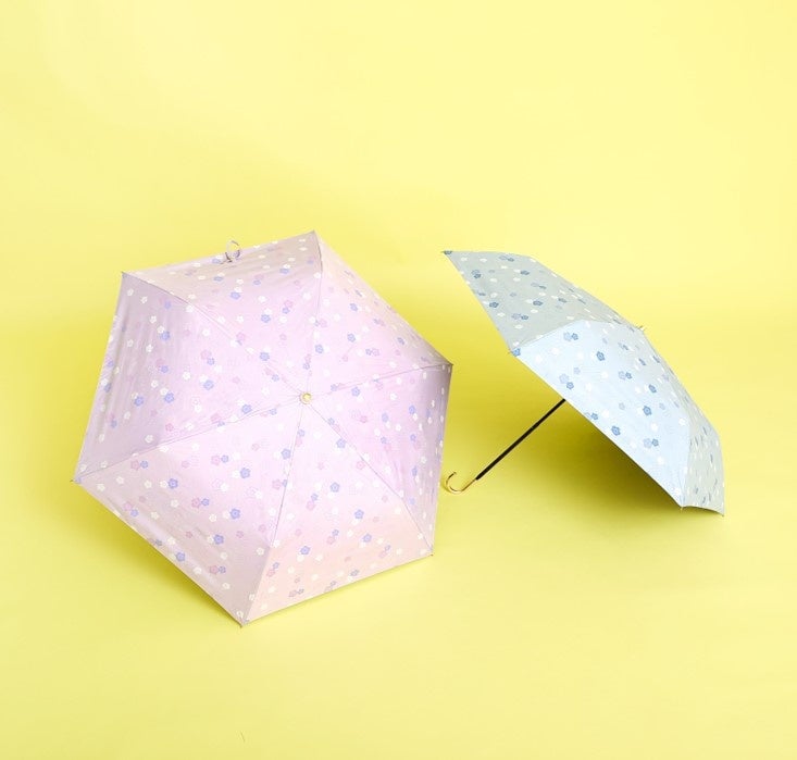 デイジーが散りばめられたデザインがキュートな折りたたみ傘。晴雨兼用。