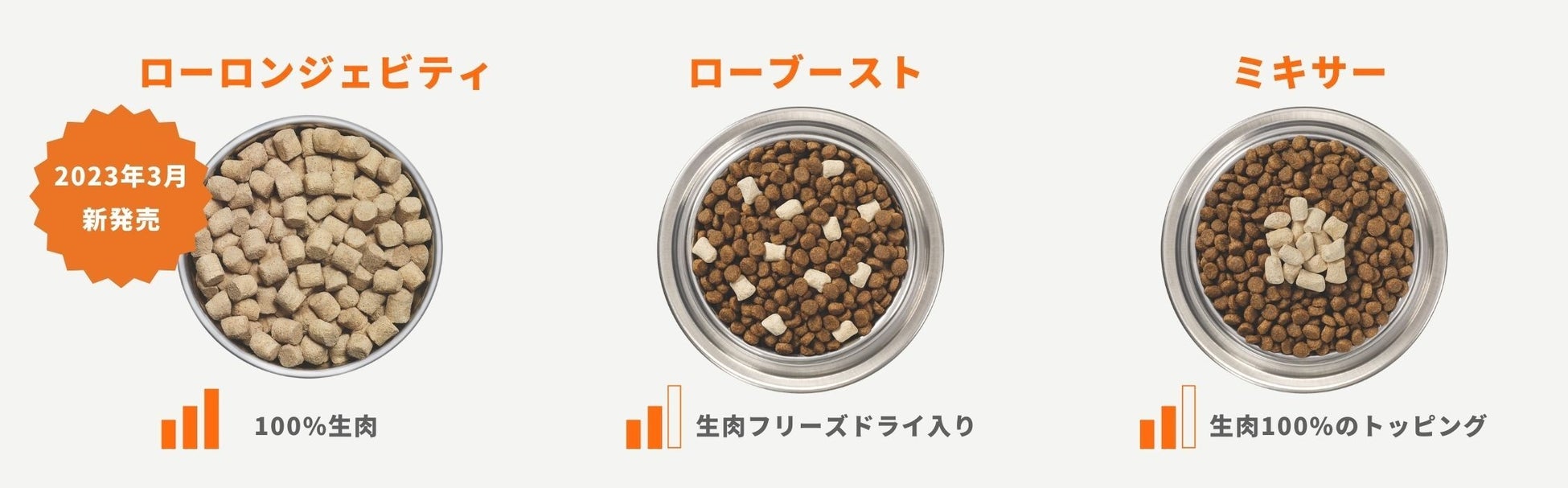 HPPを使用した生肉の加工はコストがかかるため、これまで100%ローフードの日本販売は叶わず、日本で販売されているinstinctのペットフードは、トッピングタイプや、ブレンドタイプのみでした。しかし今回、製造工程の見直しにより価格を抑え、100%ローフードの総合栄養食「ローロンジェビティ」の日本発売を実現しました。