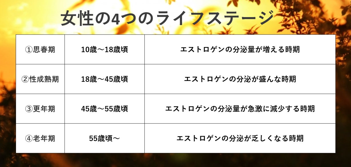 女性の一生は女性ホルモンの環境によって、思春期~性成熟期~更年期~老年期というように、大きく4つのライフステージに分けられます。特に「エストロゲン」は年齢やライフステージによって、分泌量が変化していきます。この「エストロゲン」の分泌量の変化は女性の健康に大きく関係し、この変化にともなっておこりやすい女性特有の不調があります。