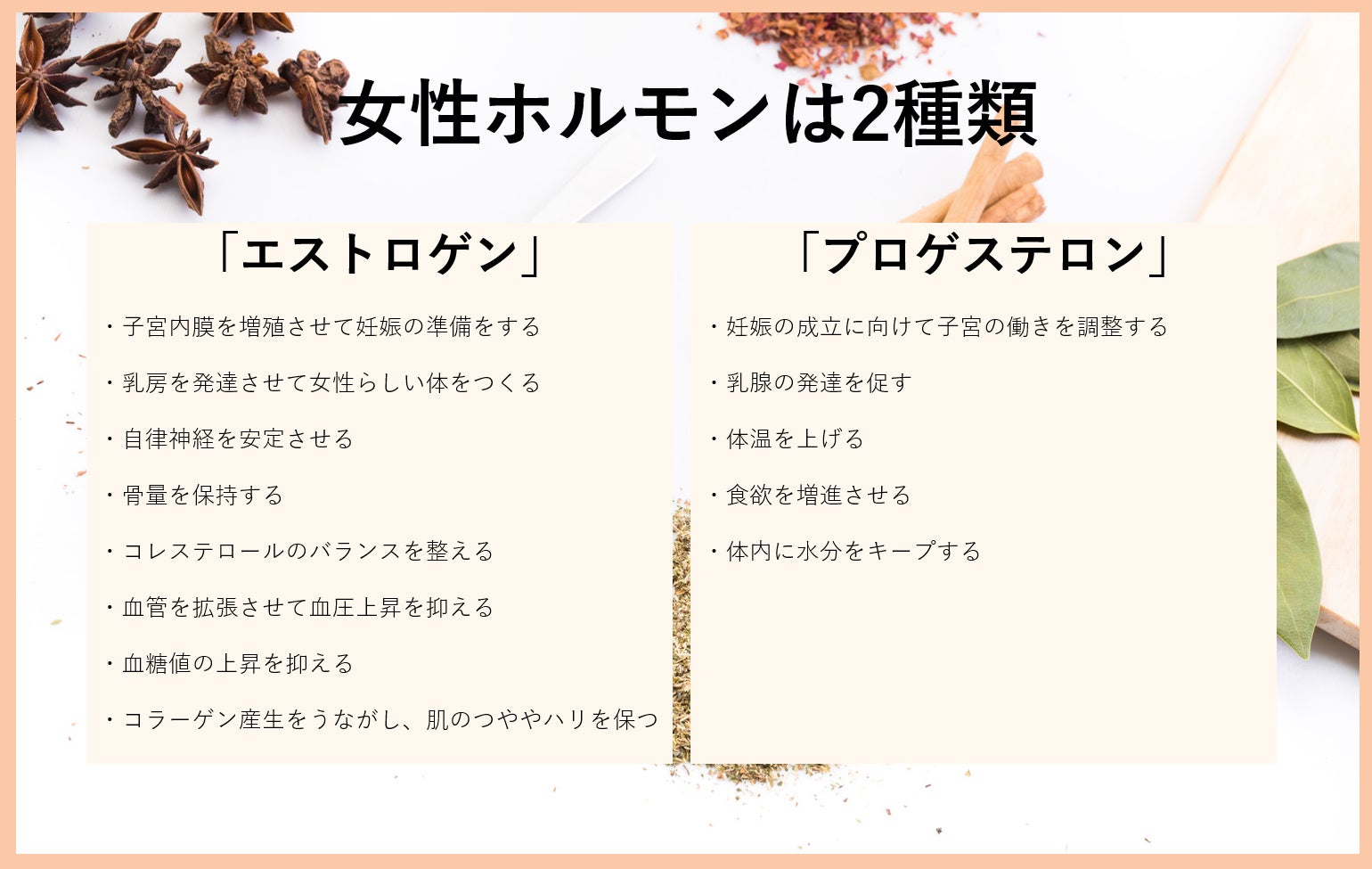 ホルモンは、カラダの色々な働きを調整する重要な物質。骨や筋肉の成長、エネルギーの代謝、血圧、食欲や食物の消化などもホルモンの影響を受けています。中でも、女性の卵巣でつくられる「女性ホルモン」には「エストロゲン」と「プロゲステロン」の2種類があります。