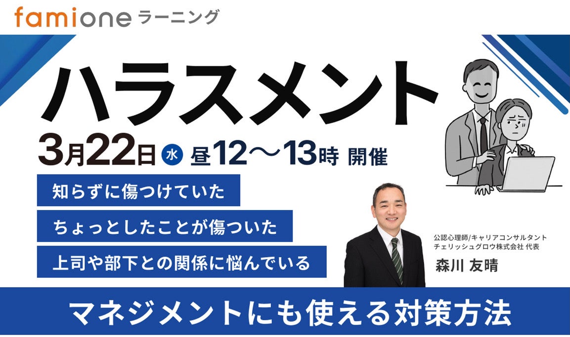 「子どもを願うすべての人によりそい 幸せな人生を歩める社会をつくる」をビジョンに掲げ、LINEを活用した妊活コンシェルジュサービス「famione(ファミワン)」 https://lp.famione.com/ を提供する株式会社ファミワン(本社:東京都渋谷区、代表取締役:石川 勇介、以下当社)は、動画学習サービス「ファミワンラーニング」 https://famione.com/learning/にて、3月22日にオンラインセミナー「職場でハラスメントにあったら ~マネジメントにも使える対策方法」を開催します。