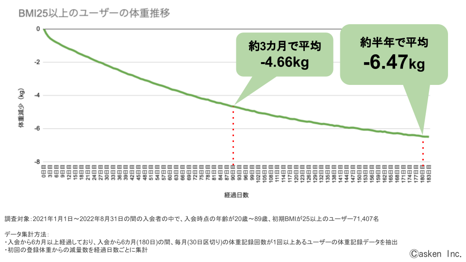 会員数800万人超*¹、国内No.1*² AI食事管理アプリ『あすけん』を開発・運営する株式会社asken(東京都新宿区、代表取締役社長 中島洋)は、この度、『あすけん』を利用する肥満傾向にあるユーザー(BMI25kg/m²以上、以下「BMI25以上」)の体重推移について調査いたしました。結果、半年で平均6.47kg の減量を達成していることがわかりました。