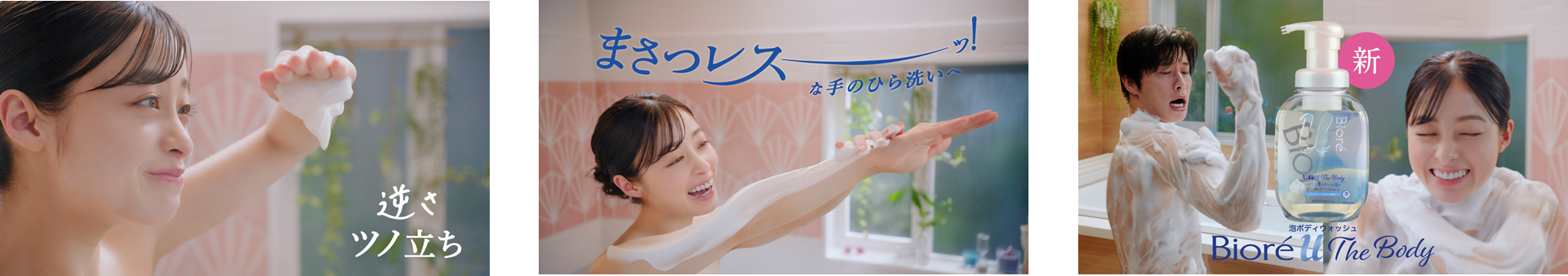 「泡ボディウォッシュ」の新CMでは、誰でも簡単にポンプを押すだけで出てくる「ツノ立ち生クリーム泡」の魅力を紹介しています。ポンプからシューッと「ツノ立ち生クリーム泡」を手のひらに出すところから始まり、泡を逆さにしたり、肌に塗り広げたりする田中さんと橋本さん。「ツノ立ち生クリーム泡」だからこそ実現する「幸せだっツノ…♡」なからだ洗いをお二人が体験する様子を描いています。