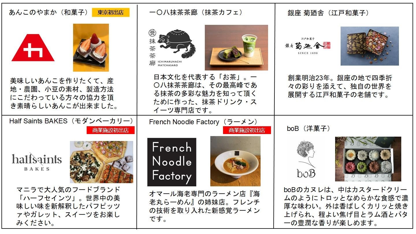 フードゾーン「DELI&DISH」では、東京初出店の和菓子店「あんこのやまか」、商業施設初出店のモダンベーカリー「Half Saints BAKES」、オマール海老専門のラーメン店「海老丸ラーメン」の姉妹店「French Noodle Factory」などが加わり、合計26店舗のこだわりが詰まった店舗が集結します。