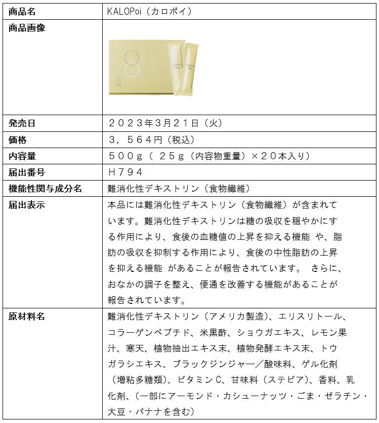 世界クオリティの業務用ヘアカラーチャートの製造や、化粧品輸入・流通加工を手掛ける株式会社スタッフス(本社:愛知県一宮市、代表取締役:白木行彦)は、様々な角度から美と健康にアプローチするブランドHANAKOLLECTION(ハナコレクション)を立ち上げ、第一弾商品として食事から摂取した糖や脂肪の吸収を抑えることが報告されている難消化性デキストリン(食物繊維)を配合した機能性表示食品「KALOPoi(カロポイ)」を2023年3月21日(火)より販売いたします。