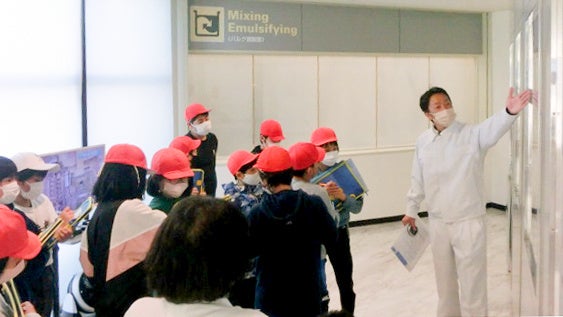 化粧品の工程や従業員の想いなど間近で化粧品製造について接していただき、「品質や衛生面を徹底している」「社会に出て頑張っている人がいる」「色々な工程が繋がらないと作れないのが大変」「大きくなったら使ってみたい」などたくさんの声を頂き、終始熱心に学習いただきました。