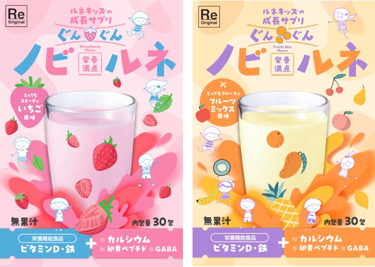 株式会社ルネサンス(本社:東京都墨田区、代表取締役社長執行役員:岡本 利治、以下「当社」)は、成長期の子どもに向けたプライベートブランドサプリメント「ぐんぐんノビルネ」を開発し、いちご風味、ミックスフルーツ風味の2商品の販売を開始しました。本商品は、子どもの成長期に大切なビタミンD、鉄、カルシウムなどの栄養素をはじめ、卵黄ペプチド、GABAを配合した栄養機能食品です。
