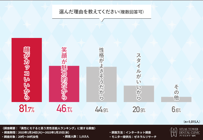 「選んだ理由を教えてください(複数回答可)」と質問したところ、『顔がカッコいいから(81.7%)』