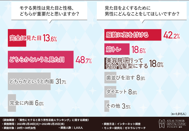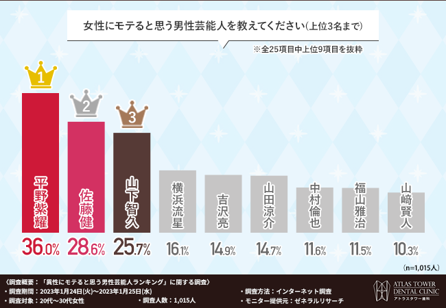 医療法人社団山手会 アトラスタワーデンタルクリニック (本社所在地:東京都目黒区、理事長:藤田 博紀)は、20代~30代女性を対象に、「異性にモテると思う男性芸能人ランキング」に関する調査を実施しました。