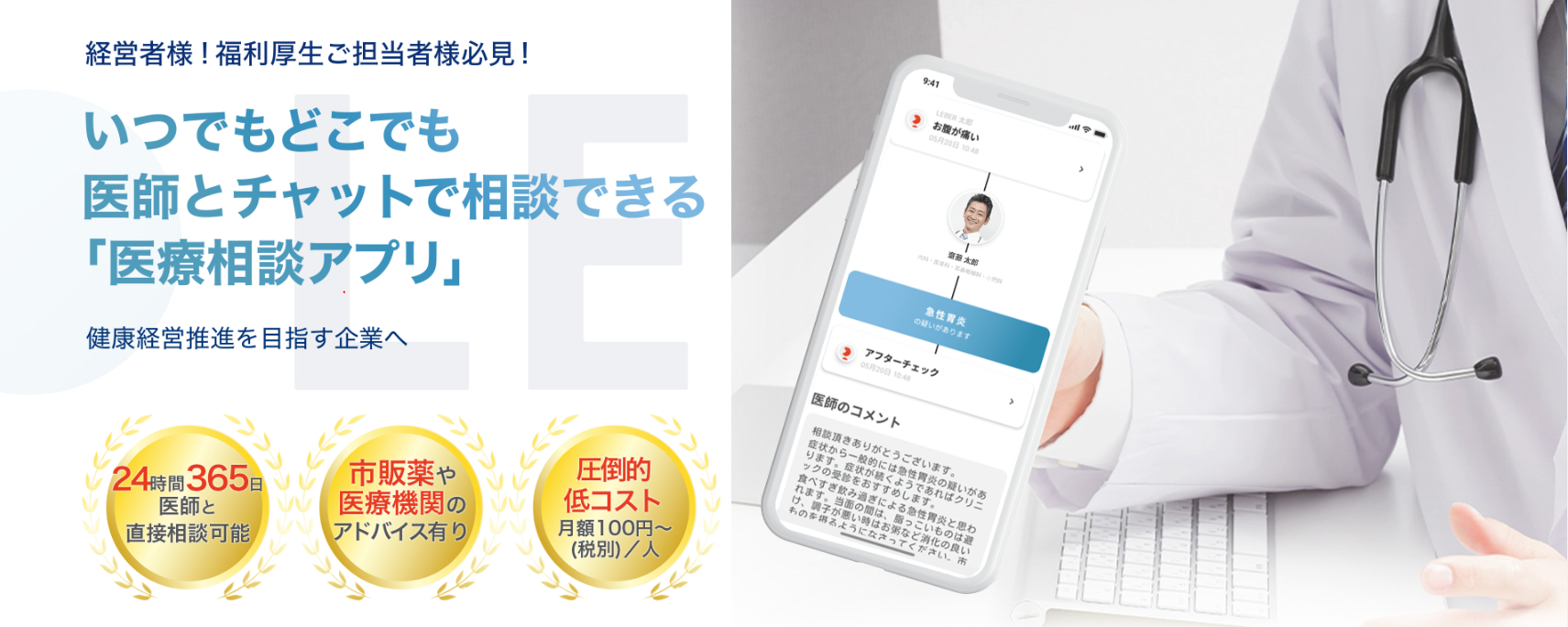 リーバーが開発した医療相談アプリ『LEBER』は月額100円~/人(法人特別価格)と非常に安価なコストで『いつでも』『どこからでも』スマホひとつで医師とチャット相談できるサービスです。