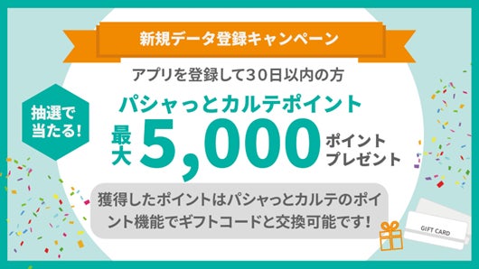2023年2月16日(月)〜2023年3月31日(金)までにパシャっとカルテをインストールかつ会員登録が完了(利用規約への同意)したユーザー様が本キャンペーンの対象となります(ただし、既に他のキャンペーンの対象となっているユーザー様は除かれます)。会員登録後、キャンペーン期間中に、エントリーを完了し、医療情報をアップロードしてデータがアプリに反映された方の中から抽選で、「パシャっとカルテ」ポイントをプレゼントいたします。