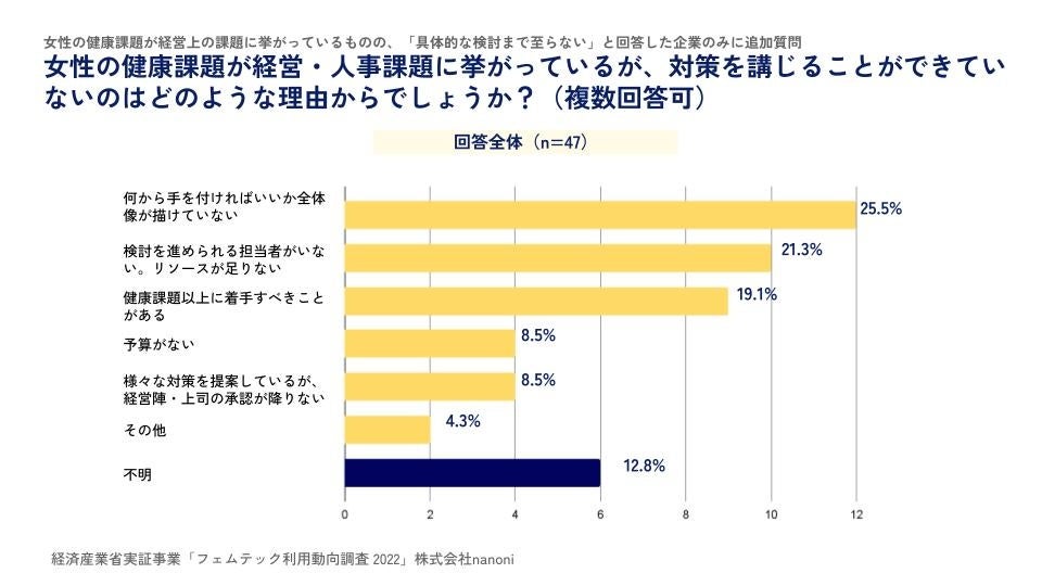 女性の健康課題を認識している企業のうち、具体的な検討まで至らないと回答した企業は22.4%となりました。その理由で最も多かった回答は「何から手を付ければいいか全体像が描けていない」(25.5%)となりました。