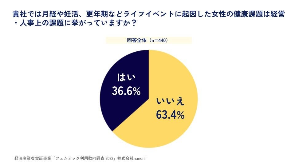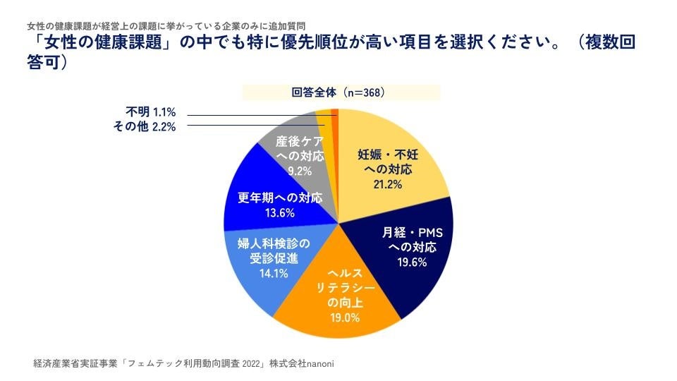 国内初のフェムテック福利厚生プラットフォーム「carefull(ケアフル)」を提供する株式会社nanoni(本社:東京都港区、代表取締役:張聖、以下nanoni)は、経済産業省令和4年度フェムテック等サポートサービス実証事業の一貫として、450の企業に対し「フェムテック利用動向調査」を実施いたしました。各社のフェムテック導入状況や経営アジェンダとの関連性を調査することで、3/8の国際女性デーに向けて、現在の企業のもつ課題意識などがわかる結果となりました。