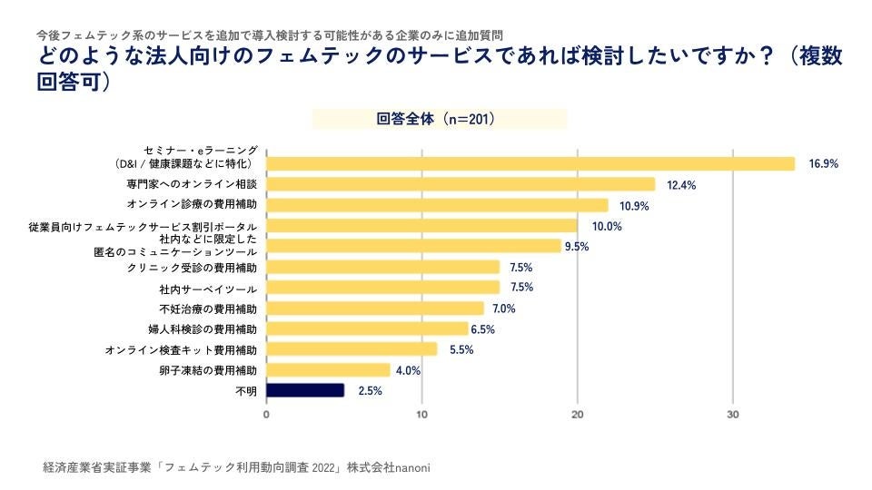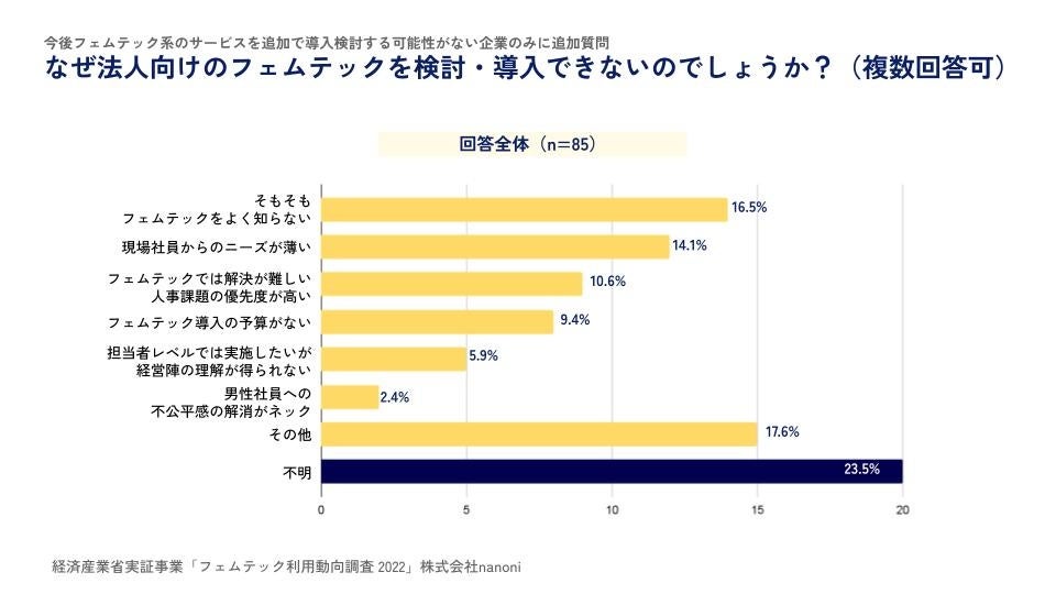 一方で、フェムテックの導入検討に否定的であった企業にとって、その回答の理由は「そもそもフェムテックをよく知らない」(16.5%)、「不明」(23.5%)となり、フェムテックに関する理解不足が導入検討の大きな阻害要因であることが判明しました。
