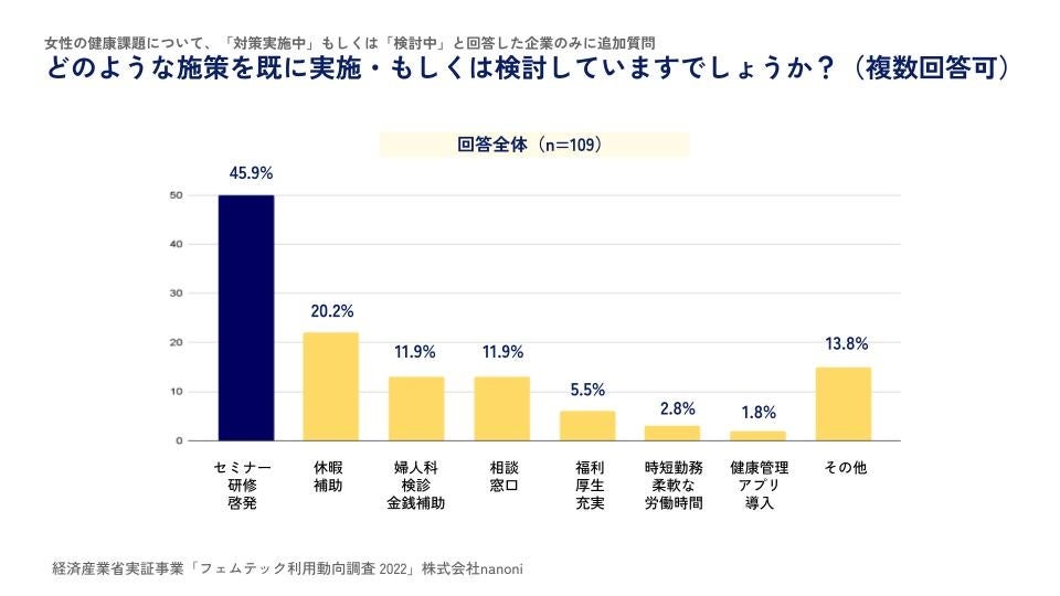 具体的に女性の健康課題の認識を持ち、具体的に対策を検討中または実施中の企業の45.9%がセミナー・研修・啓発を実施もしくは検討していました。