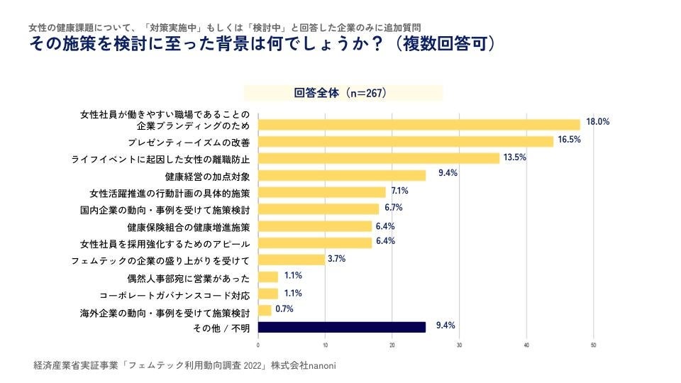 一方、9.4%の企業はその施策に至った背景として「その他・不明」と回答しました。nanoniによる個別のヒアリングの中で、「何をやるべきかわからないから、とりあえずセミナーで啓発活動をしている。他に更にやるべきことが明確になったら施策を増やしていきたい」という声が複数上がりました。