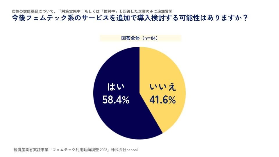 女性の健康課題を認識し、対策を実施しているまたは検討中の企業の58.4%がフェムテックに関するサービスの導入を検討したいと回答しました。フェムテックとして求めるニーズは企業によってさまざまであり、eラーニングや専門家とのオンライン相談などが上位を占めました。
