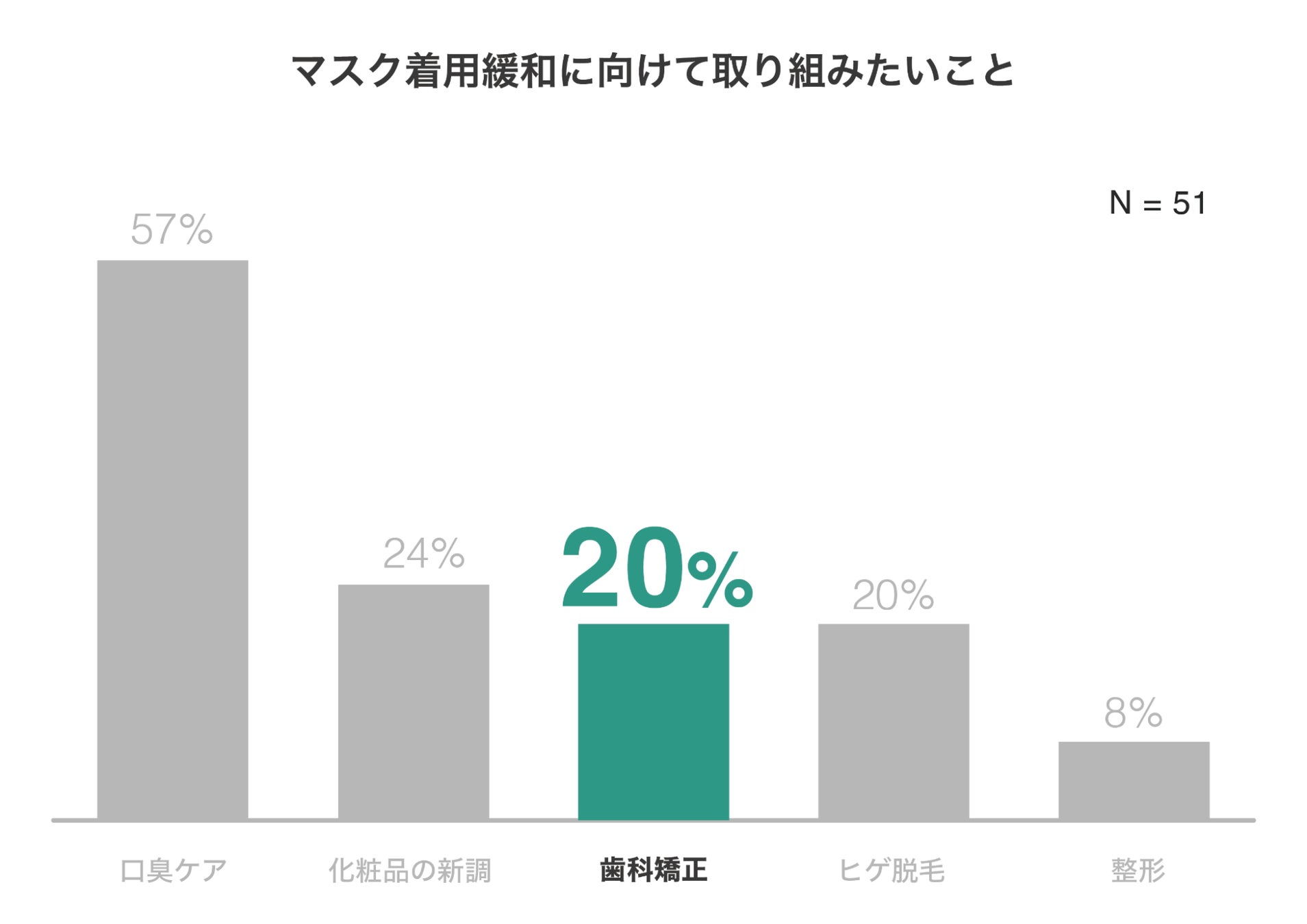 - 「マスク着用緩和に向けて取り組みたいことがある」と回答した人のうち、5人に1人が「歯科矯正に取り組みたい」と回答