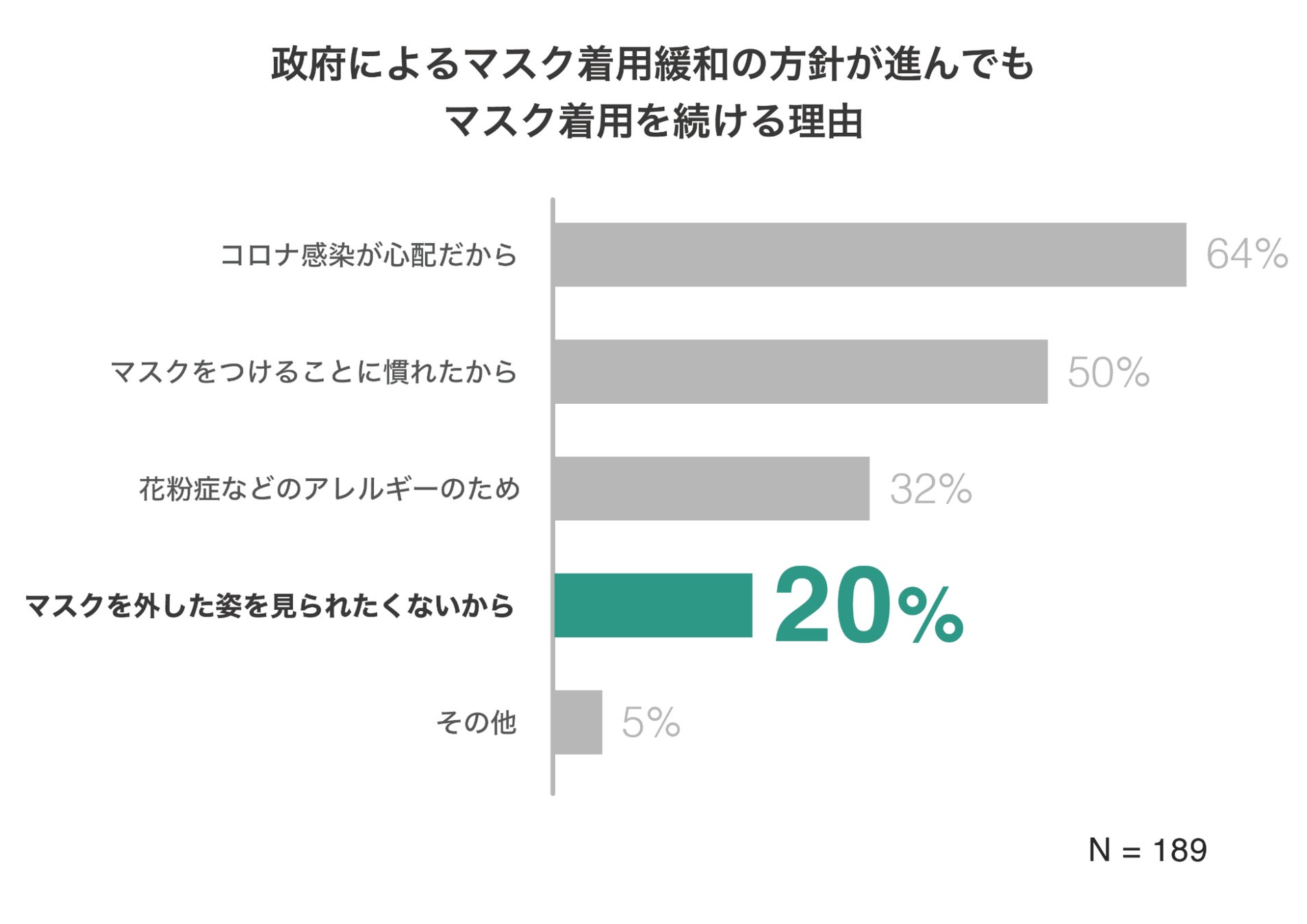 また、直接的なコロナ感染関連以外の理由として「マスクを外した姿を見られたくないから」という回答が5人に1人も見られました。長いマスク生活によって、コロナ以前には露出していた顔の部分を見せることに抵抗を覚える人も増えたようです。