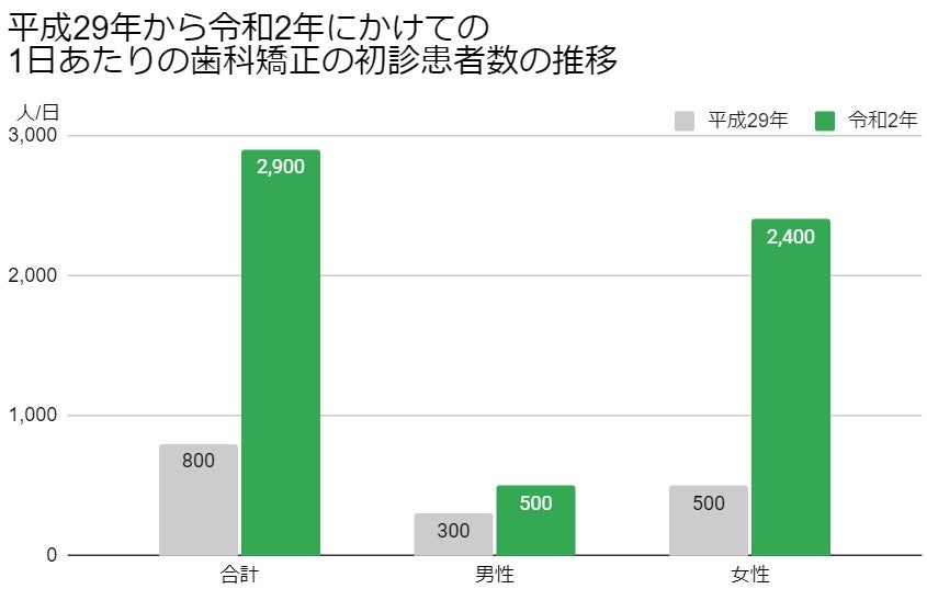 コロナ禍で歯科矯正需要は拡大しています。厚生労働省が発表している「患者調査」の結果によると、平成29年の初診の歯科矯正患者数は1日あたり800名だったことに比べ、令和2年では2,900名となっており、初診の歯科矯正患者数が3.6倍との調査結果がでました。